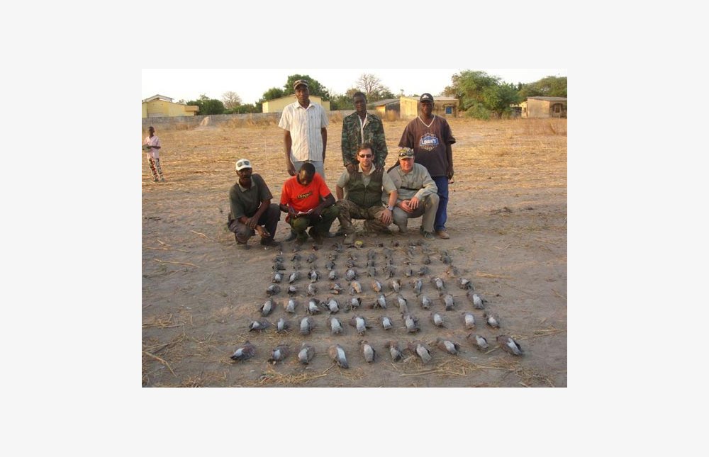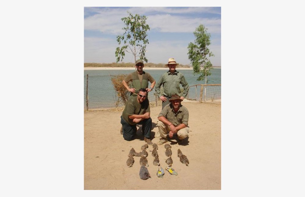 - Durant la journée, la chasse aux francolins, pintades, pigeons ou lièvres se pratique en fonction du biotope en petits groupes devant soi ou en petits rabats. En fin de journée, les chasseurs se postent près d’un point d’eau pour un affût aux pigeons, gangas et tourterelles. Chaque chasseur est accompagné d’un pisteur expérimenté.