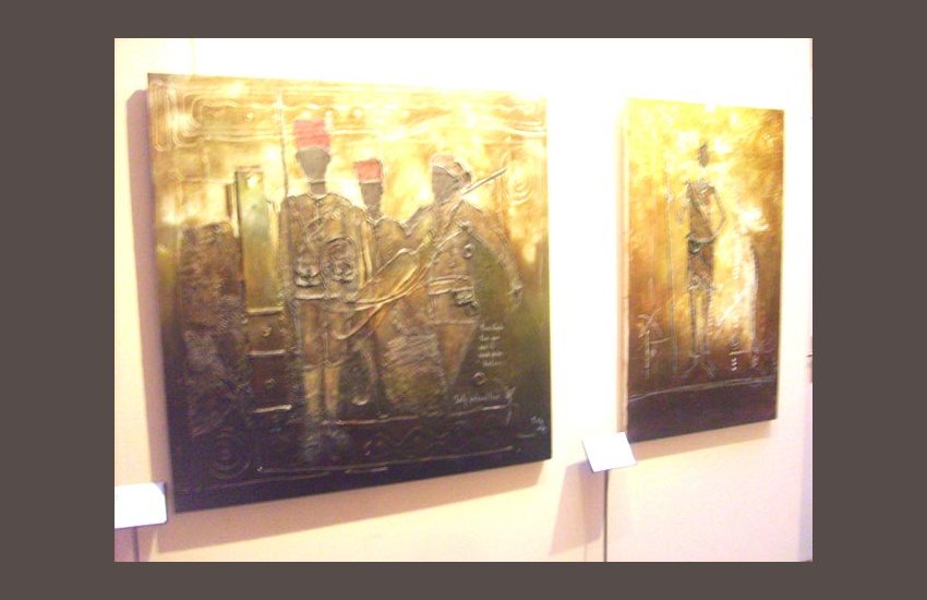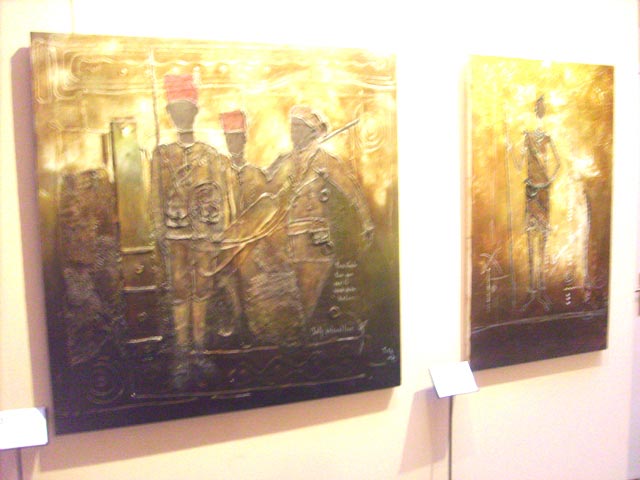 Son exposition est un cocktail de techniques et de pigments naturels. Des peintures qui racontent l’histoire, la colonisation, les tirailleurs sénégalais et interpellent le devoir de mémoire sur un jeu de couleurs beige noir à l’image du kaki livré à ces unités en 1915.