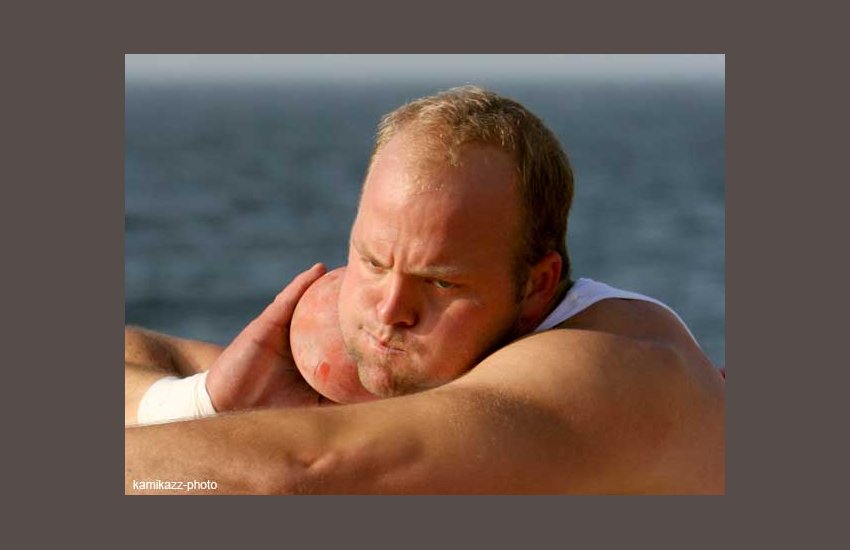 Adam Nelson, le beau bébé blond, champion du monde out door 2005, a gagné la compétition avec un lancer à 21m28 devant son compatriote Reese Hoffa, très ému par le lieu où s’est déroulé le concours.