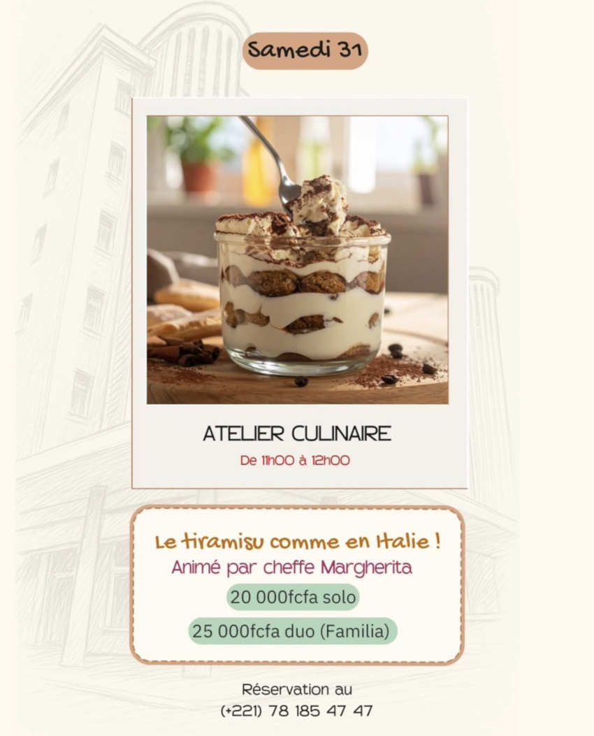 Animé par la cheffe Margherita, cet atelier invite les participants à découvrir les secrets d’un tiramisu réalisé « comme en Italie ». Entre techniques, astuces et partage, ce moment culinaire est pensé comme une expérience conviviale, accessible aussi bien aux passionnés de cuisine qu’aux curieux souhaitant s’initier à la gastronomie italienne.