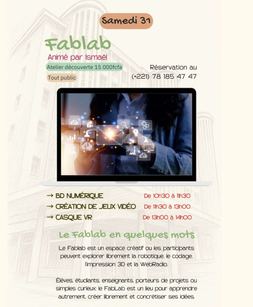 Animé par Ismaël, cet atelier propose une immersion dans l’univers du Fablab à travers plusieurs expériences accessibles à tous : bande dessinée numérique, création de jeux vidéo et découverte de la réalité virtuelle avec casque VR.