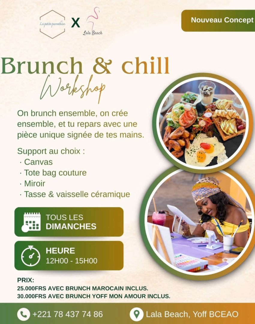 Le Brunch & Chill – Workshop est une expérience créative et gourmande organisée tous les dimanches à Lala Beach, à Yoff. Le concept est simple : on brunch ensemble, on crée ensemble, puis chacun repart avec une pièce unique réalisée de ses propres mains.