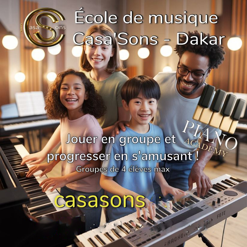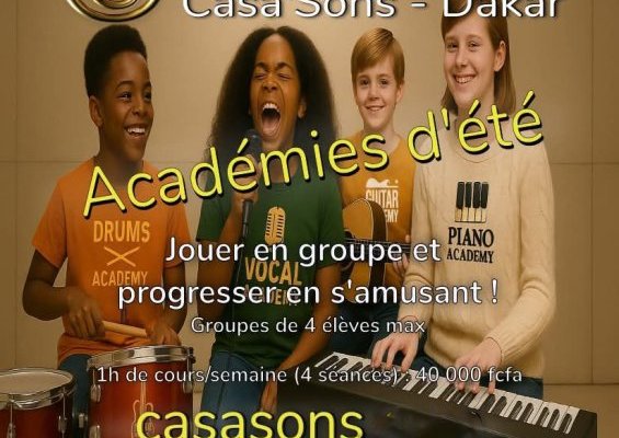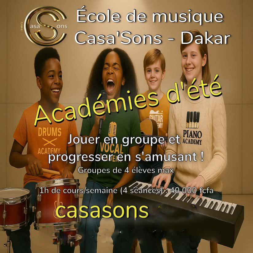 L’école de musique Casa’Sons, située dans le quartier des Mamelles à Dakar, propose des cours de musique pour tous, dès l’âge de quatre ans. Elle offre un large choix de disciplines : éveil musical, solfège, trompette, trombone, tuba, saxophone, piano/clavier, guitare, guitare basse, batterie, chant, kora, musique assistée par ordinateur, composition et musique de film.