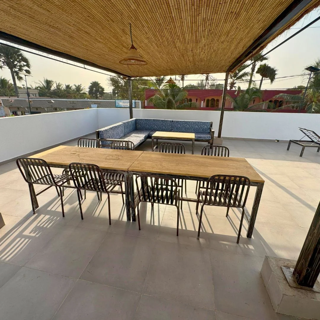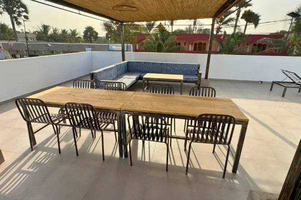 Toutes les chambres donnent sur une grande terrasse commune, aménagée avec des canapés d’extérieur et des tables. C’est l’endroit idéal pour lire, vous reposer ou partager un moment convivial en admirant la vue sur la piscine et le village.