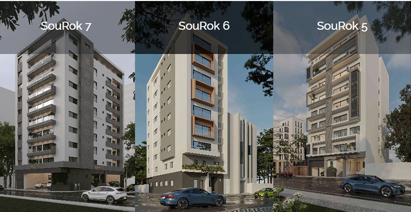 SouRok 5, 6 et 7 sont des projets immobiliers haut standing allant de R+8 à R+9, situés dans les quartiers prisés de Point E et Mermoz, dans la région de Dakar. Ils proposent des appartements de type F2, F3, F4 ainsi que des penthouses, avec un ensemble de commodités.