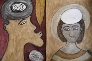 Et pourtant, son œuvre nous emporte vers une unité qui contient la variété du monde. Ce tout se tient et s’éprouve. Mais le tout naît de pas grand-chose : d’une trace sur un mur, d’une feuille de manguier, d’un fil à coudre qui fait éclore des visages, des symboles sacrés et motifs. Ses œuvres incarnent le débordement : chaque figure dessinée - de l’oiseau, à l’arbre, à l’homme, à l’œil, - ne s’arrête jamais à sa forme, mais se déploie et s’étire au-delà de ses contours. Un art qui chatouille la spiritualité, la spiritualité qui caresse l’art. Une humanité possible. Une unité.Une ouverture.