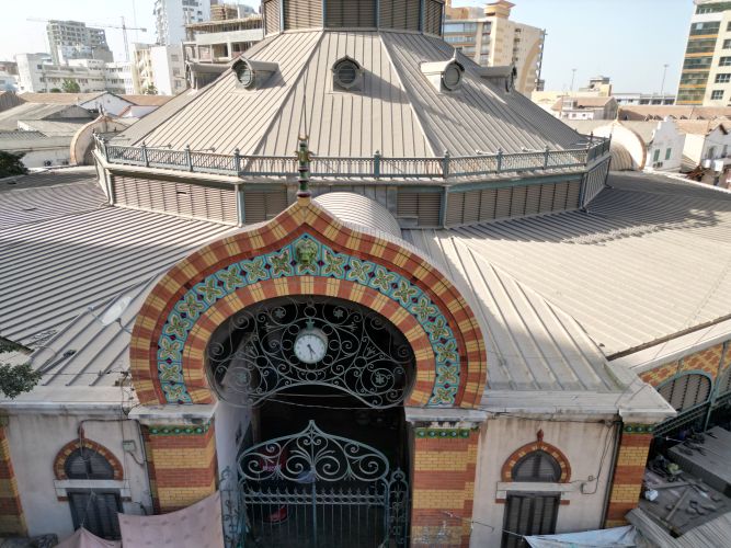 Le marché Kermel, fondé en 1862 avec la création de Dakar, a une histoire riche. D’abord conçu comme un simple hangar métallique, il a évolué en un marché monumental en 1910. Son architecture mêle différents styles de l’époque, rappelant les marchés français conçus par Baltard et présentant des éléments arabo-musulmans.
