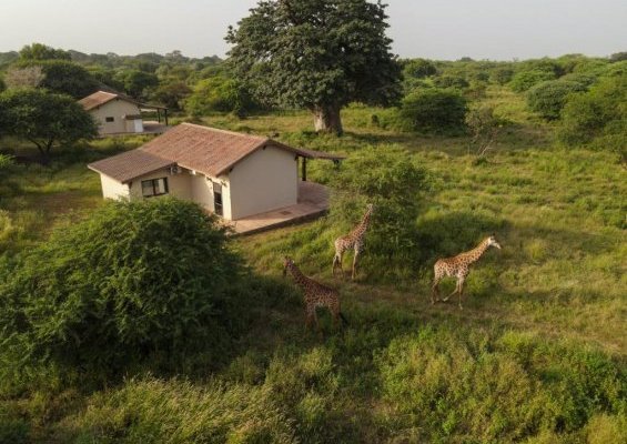 Lodges qui donnent sur une réserve privée où vivent en liberté des girafes, des impalas, des élands du Cap, des autruches et bien d’autres animaux.