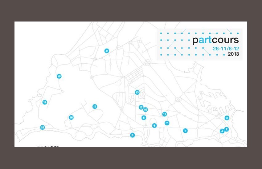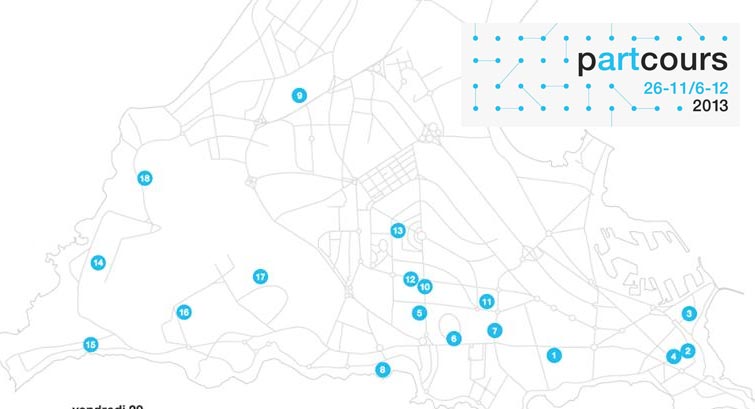 Dix-huit vernissages sont étalés sur onze jours en suivant un parcours de zones dans la ville. Chaque jour vous trouverez des événements localisés dans une de ces zones, dans des plages horaires assez larges.
