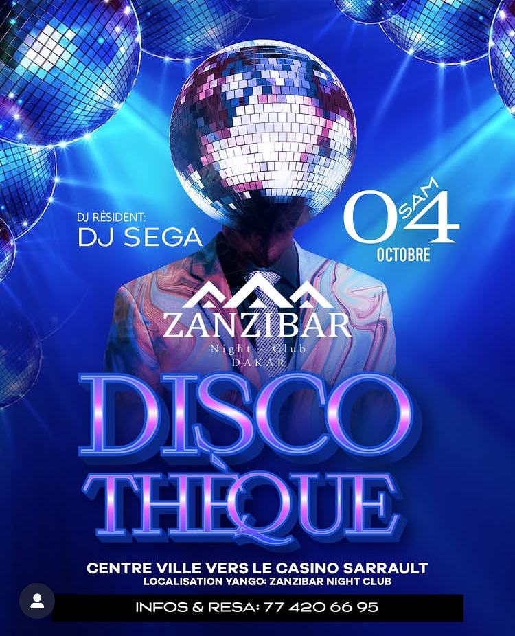 Rendez-vous le samedi 4 octobre 2025 au Zanzibar Night Club, en plein centre-ville de Dakar, pour une nuit électrisante de 23h à 5h du matin. Le DJ résident Du Sega fera vibrer la piste avec ses mixes incontournables, entre disco, house et rythmes afro.