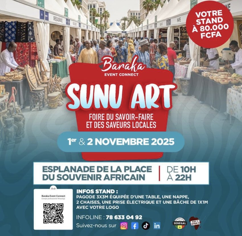 Organisé par Baraka Event Connect, le salon Sunu Art met à l’honneur l’artisanat, la mode, la gastronomie et les produits locaux dans une ambiance conviviale et festive. Les visiteurs pourront découvrir une sélection variée d’exposants venus de tout le pays : créateurs, producteurs, chefs et artistes partagent leurs passions et leurs talents autour d’un même objectif : promouvoir la richesse culturelle et culinaire du Sénégal.