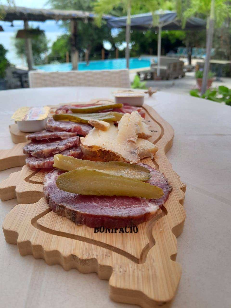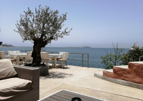 La terrasse ombragée, ouverte à tous, offre une vue imprenable sur la mer pour des instants mémorables.