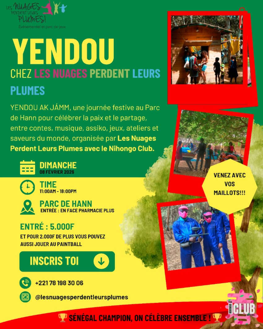 Yendou ak Jàmm est une rencontre culturelle et festive ouverte à tous, pensée comme un espace de rencontres, de joie et de vivre-ensemble. Tout au long de la journée, le public est invité à profiter d’une programmation riche mêlant contes, musique, assiko, jeux, ateliers créatifs et saveurs du monde.