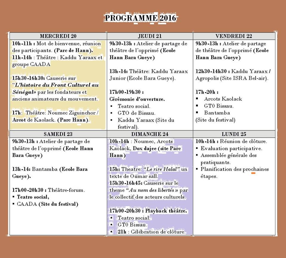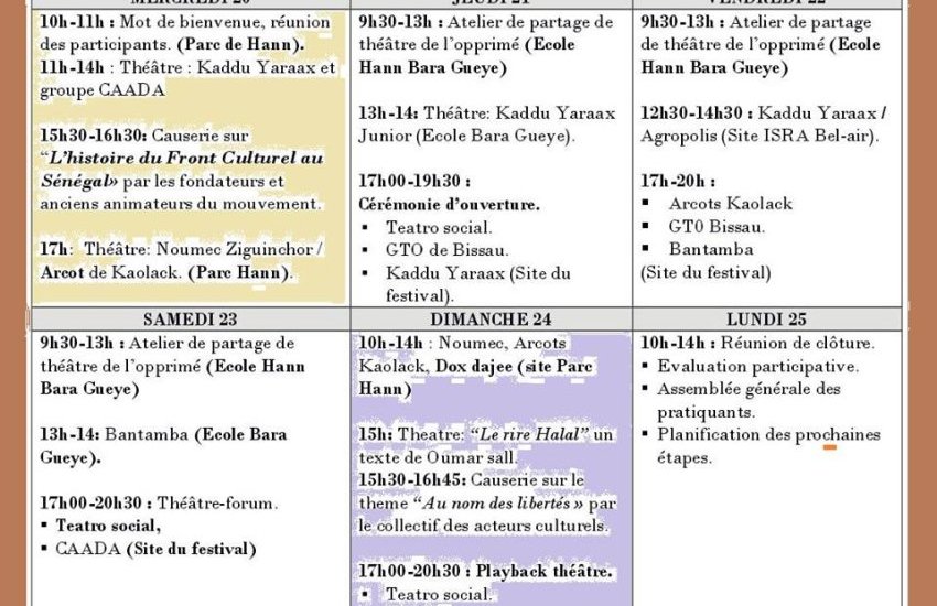 Kaddu Yaraax Théâtre-Forum présente le festival sénégalais de théâtre-forum, un événement qui s’adresse à toutes les formations du monde entier qui s’expriment à l’aide des techniques du théâtre de l’opprimé.