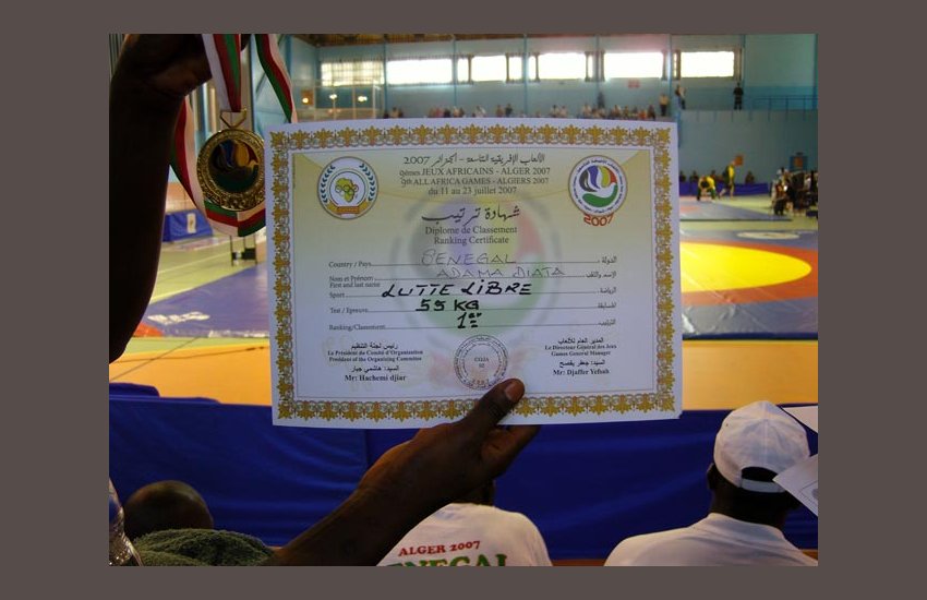 Champion du Sénégal 2005, puis médaillé d’or aux jeux africains 2007 d’Alger, Adama Diatta, debout sur ses 1 m 65 pour 55 kg, remporte de nouveau l’or et décroche sa qualification pour Pékin 2008 lors des championnats d’Afrique de Tunisie. Il doit son talent à l’ancien lutteur olympique Jean Echocolar qui avait installé un dojo dans sa ville natale : « il m’a amené dans sa salle pour me former en lutte parce qu’avant, je faisais du judo. C’est en 2007 que je suis venu Dakar en regroupement après une compétition qui m’a valu une sélection en équipe nationale. Mon premier tournoi international a été difficile parce que je manquais d’expérience. Avec le courage, j’en suis sorti victorieux » se souvient Adama.