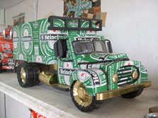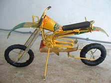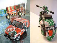 Actuellement Baba a plus de 40 modèles d’objets de décoration : moto, scooter, vélo, auto, camion, hélicoptère, avion, jeep, masque, malette, plateau... et même un porte papier toilette (très sympa pour vos toilettes !). Certaines personnes lui amènent même les cannettes pour des commandes spéciales. Il fait travailler 3 personnes à temps plein, plus les enfants qui continuent le ramassage des cannettes. Il a un point de vente à Paris dans une boutique CSAO mais cela n’est pas suffisant et il aimerait vraiment en trouver d’autres. Son rêve : ouvrir une boutique à lui en Europe.Baba part en Autriche le mois prochain (c’est sa première fois en Europe) pour une exposition d’objets de décoration invité par Ars Electronica. (du 7 au 12 septembre 2002). Nous lui souhaitons bon voyage et qu’il revienne avec d’autres modèles encore plus fameux.