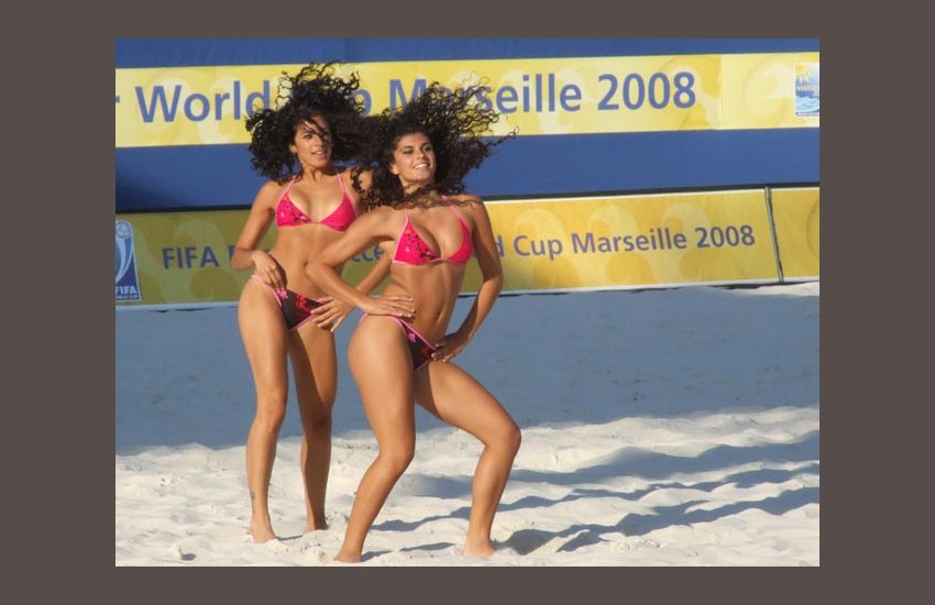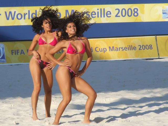 Sur le terrain ensablé c’est le spectacle foot- danse et c’est aussi la fête dans les tribunes. Sous une mélodie de « Tecktonik » et de la « Samba », les différentes chorégraphies exécutées par ces charmantes espagnoles égaient le public marseillais qui répond de plus en plus nombreux au mondial de Prado.