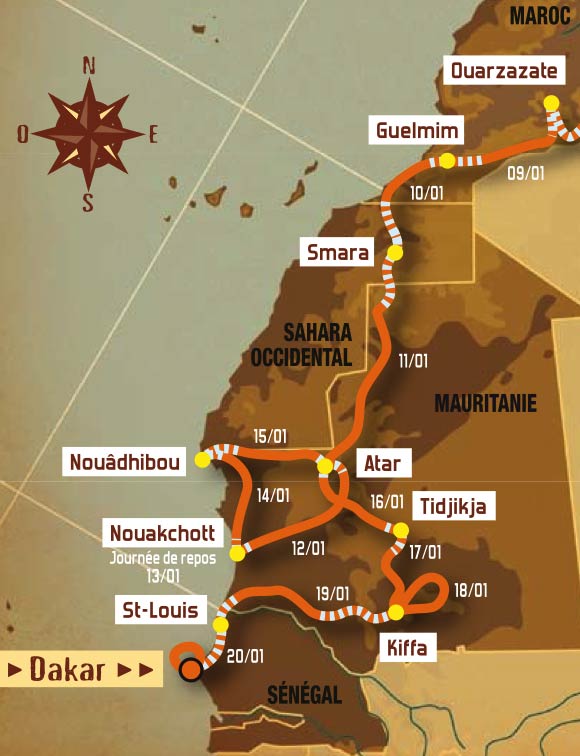 Le désert constitue le fait marquant d’une épreuve plus longue et qui débutera par deux spéciales au Portugal avant de traverser le Maroc. Les quatre jours en territoire marocain ne seront pas de tout repos avec au menu du hors-piste, du sable et de la rocaille ; et une semaine de Mauritanie ! Le fait marquant de ce rallye sera les deux tracés pour les motos et