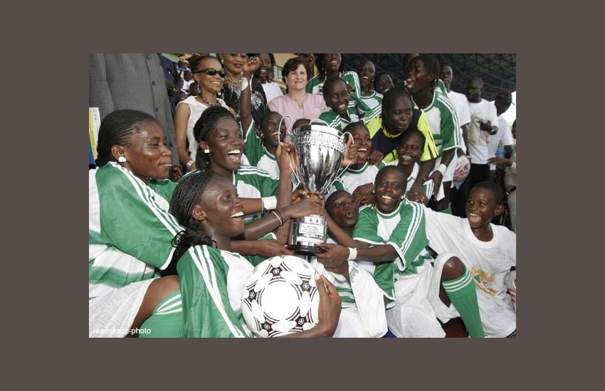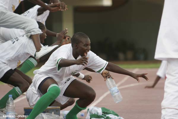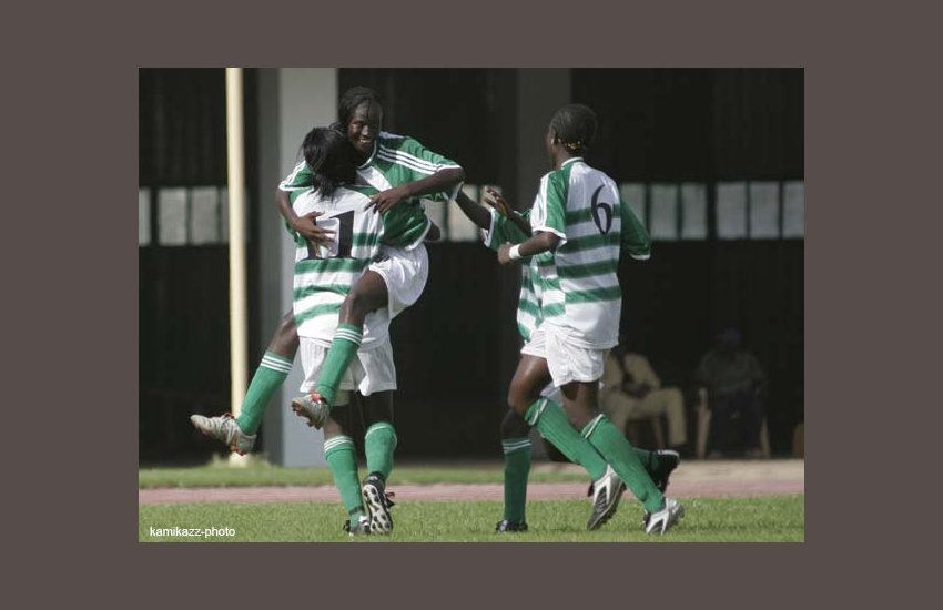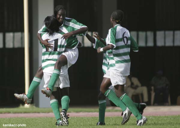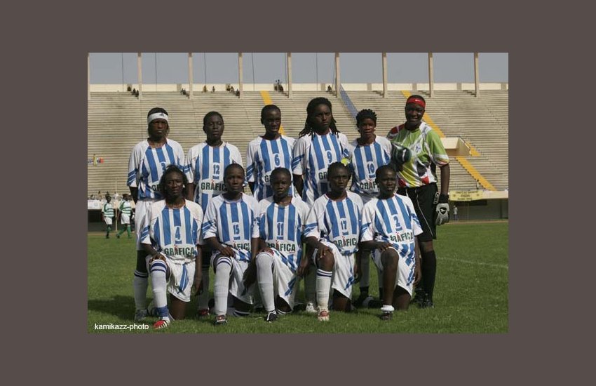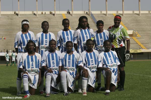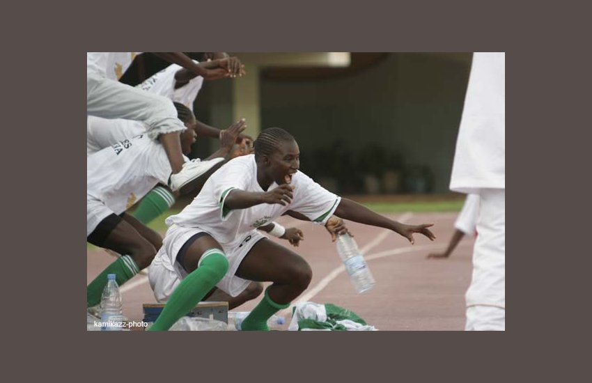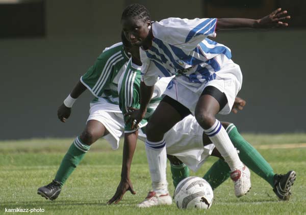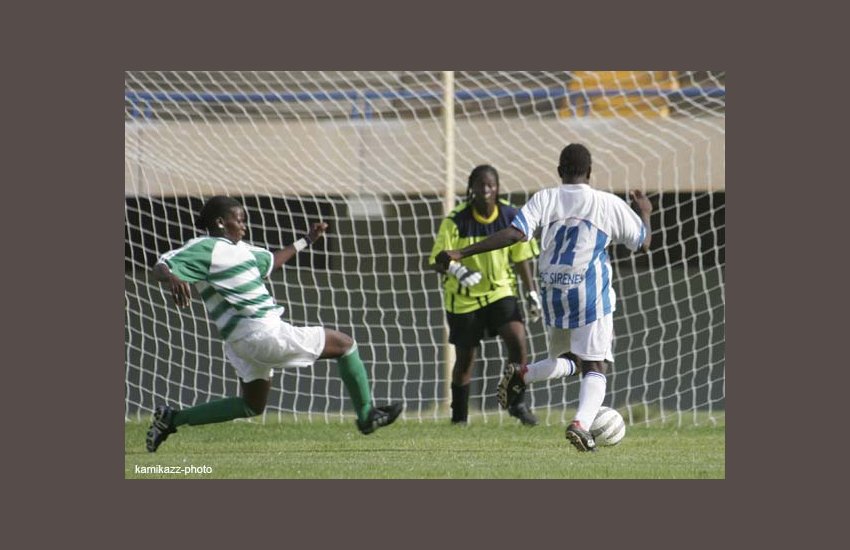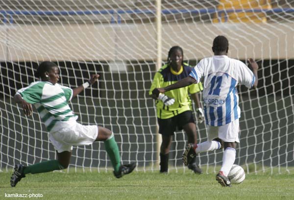 Un grand match ! Les aigles de la Médina (en vert et blanc) et les sirènes de Dakar (en bleu et blanc) nous ont gratifié d’un beau jeu. Physiques et techniques, les joueuses ont oubliés la chaleur dominicale pour que finalement les aigles s’imposent sur le score de 5 à 2.