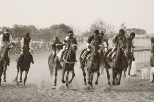 La corde se lâche, le départ est donné. Les 9 chevaux des différentes écuries s’élancent au galop. Dans la tribune, les femmes belles, vêtues de leur robe de dimanche ne quittent pas des yeux la course. Elles se lèvent, dansent et crient de joie à l’arrivée de leur cheval favori.