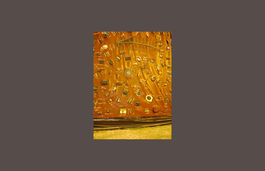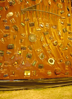A l’entrée, une tour d’accueil réalisée par le plasticien Viyé Diba trône dans la vaste prairie des Filtres. Un gigantesque mur de dix mètres de haut et quelques tonnes qui présente « la récupe humanisée », soit mille et un objets du quotidien collectés auprès des habitants de Dakar et portant leur nom.