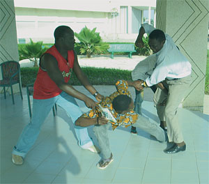 L.B. : (ils soupirent, s’étirent) C’est une histoire un peu longue et compliquée. Pour être bref et concis, nous dirons qu’au début, on a accepté un cachet standard très modeste parce que le réalisateur nous avait promis une augmentation quand on sera au niveau de la troisième saison. Finalement, nous avons joué jusqu’à la cinquième saison avec le même cachet, pire encore, il n’y avait plus de respect envers les comédiens et il cherchait à destabiliser le groupe et des tas d’autres désagréments… Quand on a décidé de tirer les choses au clair avec lui, le divorce était inévitable car il nous avait traité : « d’africains ingrats » et qu’il n’avait pas à négocier avec nous. « Vous vivrez toujours comme ça ! » a t’il ajouté. Ce qui nous rassure, c’est que ses bailleurs de fonds sont venus constater combien il s’est enrichi sur notre dos et les faux cachets qu’il prétendait nous payer afin de recevoir des subventions de leur part.