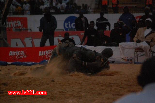 Après quelques balancements de bras, le chef de file de l’école de lutte Balla Gaye lance les premiers coups. Modou Lô riposte, son adversaire amorce une attaque et réussit à le ceinturer avant de lui imposer sa technique et sa force.