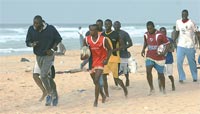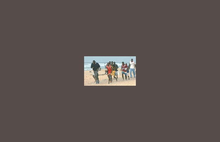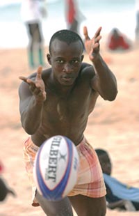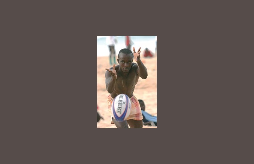 Tous les lundi, mercredi, vendredi et samedi, ils sont plus d’une trentaine de jeunes à enfoncer les jambes dans le sable fin de la plage Malibu pour acquérir de nouvelles performances sous les directives de l’entraineur Djibril Keïta : plaquage, passe, essai, mêlés…