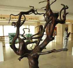 D’abord agriculteur et constructeur d’habitats écologiques, Alphonse Ndiaye mène depuis plus de quinze ans un travail original d’assemblage de bois flottés. Il se définit en effet plus comme un assembleur que comme un sculpteur. Ses pièces sont avant tout le résultat d’une attention portée à un environnement naturel, d’une observation de ce qui l’entoure. Amoureux de la nature, Alphonse Ndiaye utilise des teintures naturelles, préfère les chevilles en bois aux clous et cherche à prolonger les formes plutôt qu’à les contraindre.