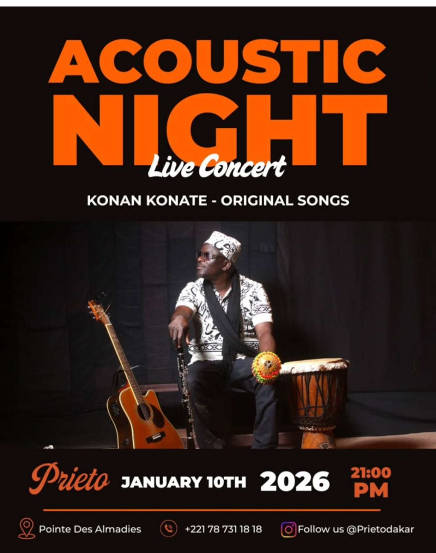 Live Concert de Konan Konaté avec ses chansons originales, à Prieto, pour une expérience sonore chaleureuse et immersive, dans un cadre convivial à la Pointe des Almadies.