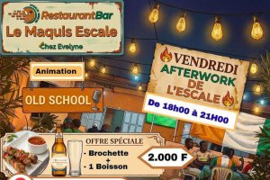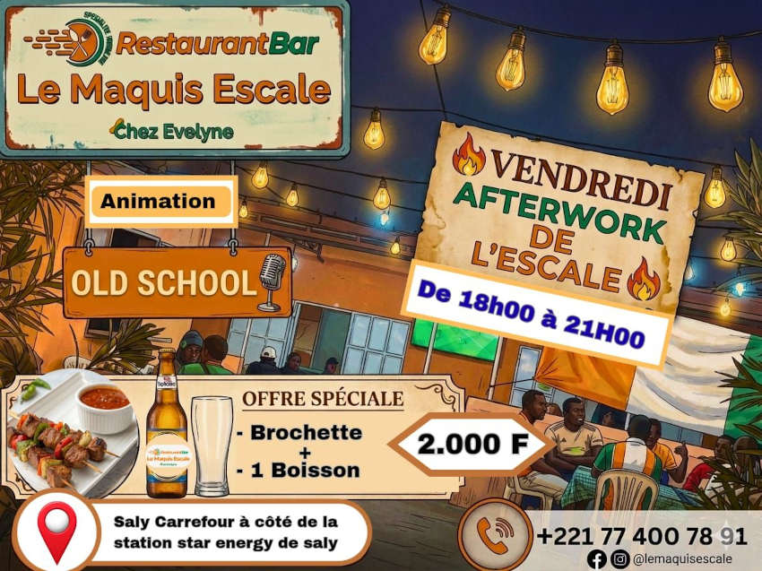 Chaque vendredi, l’établissement met en place un moment de détente destiné aux actifs souhaitant prolonger la journée dans un cadre informel. L’animation musicale met à l’honneur des sonorités old school, accompagnées d’une formule accessible combinant brochette et boisson. L’événement s’inscrit dans une dynamique de convivialité, favorisant les retrouvailles entre collègues ou amis en début de soirée.