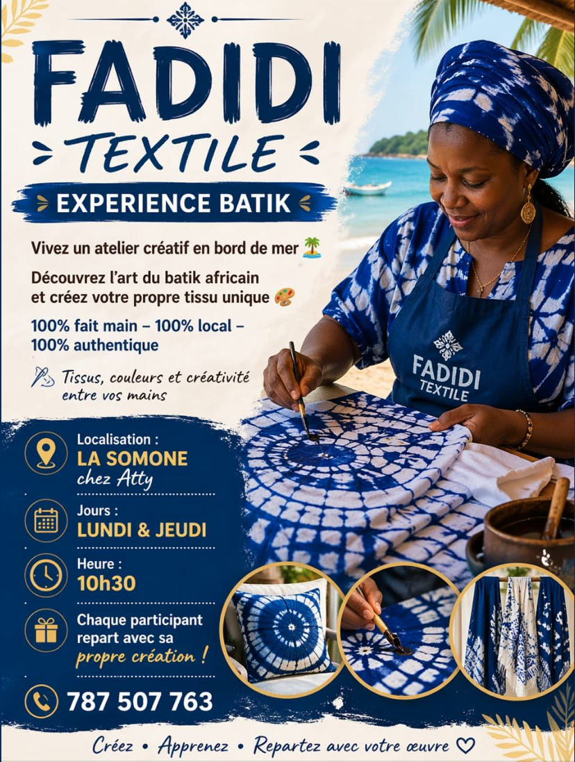 Organisé chaque semaine, cet atelier permet aux participants de s’initier aux techniques du batik africain aux côtés des artisans de Fadidi Textile. Accessible à tous, il offre l’opportunité de réaliser sa propre pièce tout en découvrant les étapes de fabrication, du dessin à la teinture. L’expérience se prolonge sur place avec la possibilité de déjeuner en terrasse, dans un environnement calme et ouvert sur la mer.