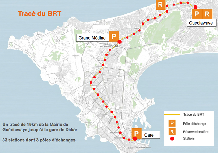 La ligne BRT (bus rapides sur voie réservée) prévue entre la préfecture de Guédiawaye et la gare routière de Petersen (18,3 km) aura une capacité quotidienne de 300 000 passagers, dont 27 000 pendant les heures de pointe.
