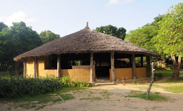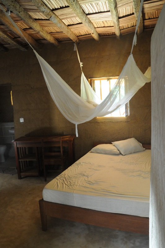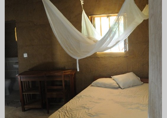 A proximité de l’embarcadère des pirogues, dans une case à impluvium traditionnelle Le Campement villageois d’Affiniam dispose de 22 chambres avec éclairage solaire et moustiquaires.