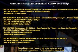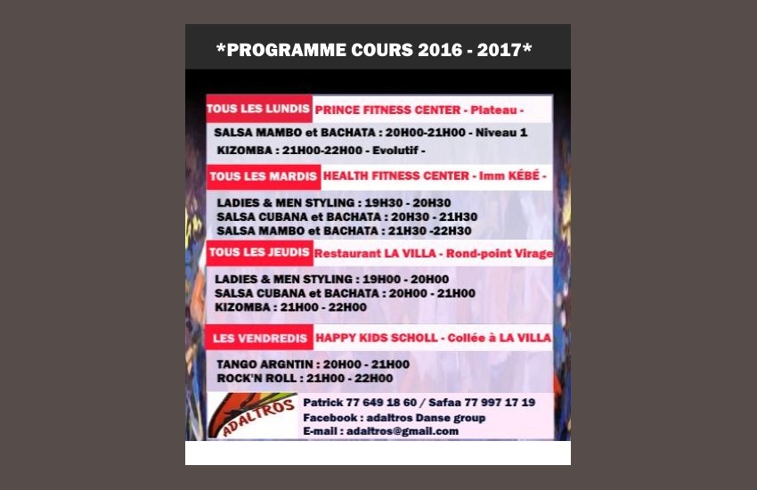 Pour chaque module supplémentaire 15 000 cfa/mois/personne sauf tango argentin 18 000 cfa.