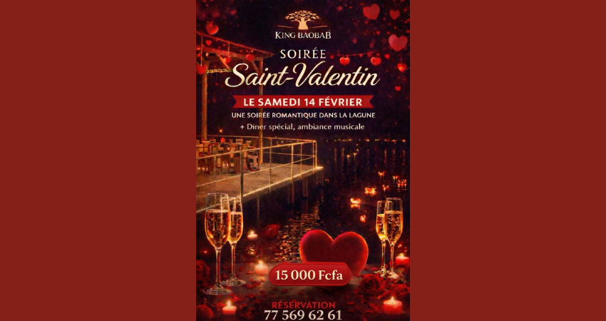 Le King Baobab propose une soirée romantique au cœur de la lagune, le samedi 14 février. Entre dîner spécial et ambiance musicale, cette célébration invite les couples à partager un moment convivial dans un cadre naturel apaisant.