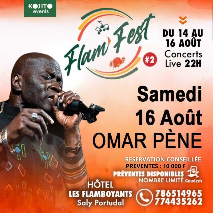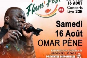 Le samedi 16 août 2025 à 22h, la scène du Flam Fest accueillera Omar Pène, icône de la musique sénégalaise et voix légendaire du Super Diamono. Avec son style unique mêlant mbalax, jazz et influences afro, il offrira au public une soirée inoubliable .