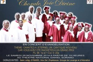 La chorale Joie Divine, chorale du temple de l’église protestante du Sénégal organise le samedi 29 novembre 2014 à 19h au théâtre national Daniel Sorano, un grand concert d’évangélisation.