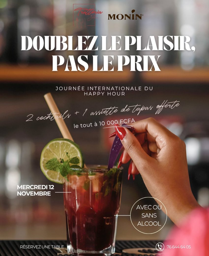 Pour la Journée internationale du Happy Hour, Trattoria 21 et Monin vous proposent une offre irrésistible : 2 cocktails + 1 assiette de tapas pour seulement 10 000 F CFA le mercredi 12 novembre !