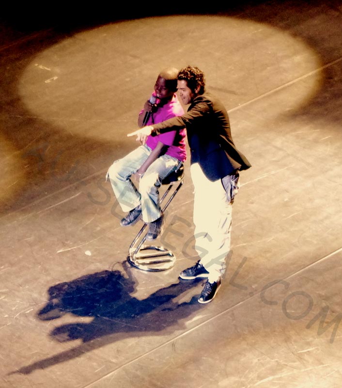 Après une dédicace à Youssou Ndour en entonnant son tube « Set », les sketchs se sont enchaînés, le public a activement participé et le spectacle s’est terminé sur un diaporama des moments importants de sa vie, des photos de ses spectacles, films de sa famille et de son mariage...
