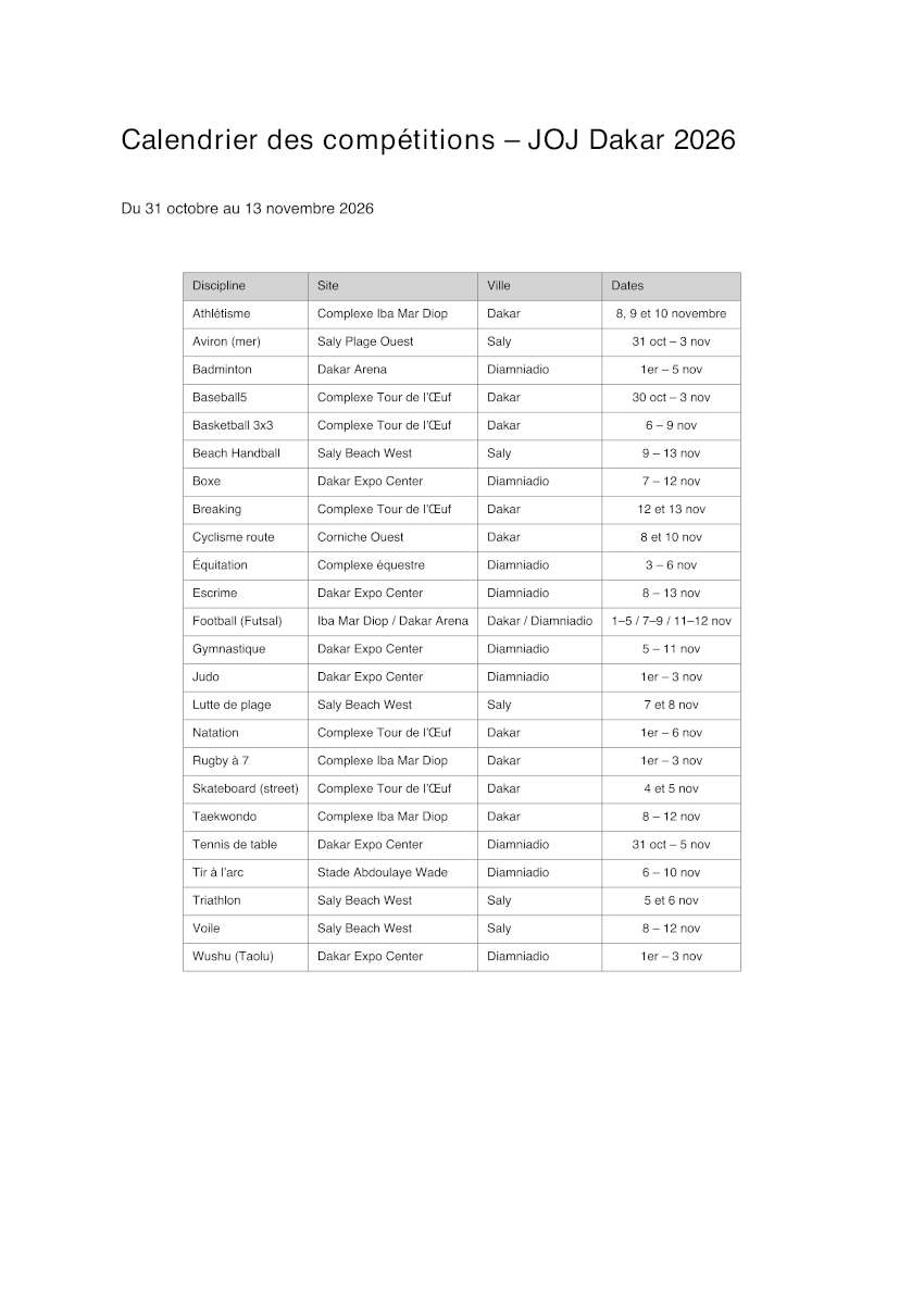 - Programme détaillé : https://www.au-senegal.com/IMG/pdf/calendrier_joj_dakar_2026.pdf
