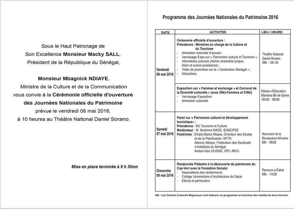 Initiées en 1996, les journées nationales du patrimoine visent à sauvegarder et à valoriser des valeurs du patrimoine culturel sénégalais. Elles se tiendront du 6 au 8 mai 2016 à Dakar. Le thème de cette année est : « Patrimoine culturel et développement touristique : un levier de croissance pour le PSE ».