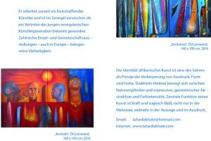Taha Diakhaté est un artiste plasticien connu pour la pertinence de ses œuvres. Il travaille surtout avec la peinture à huile et utilise plusieurs techniques (superpositions de toiles, collages, acrylique, pigments) pour réaliser ses tableaux.