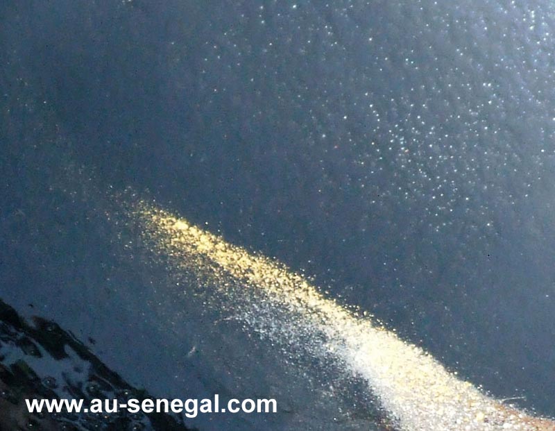La poudre obtenue par broyage, concassage et meulage est entrainée puis délayée sur des plans incliné appelés « moquettes » où la poussière d’or plus dense se dépose et est recueillie. Ou encore cette poussière et les pépites sont séparées par mouvements rotatifs à la « battée » comme dans nos vieux films de la ruée vers l’or style hollywoodien.