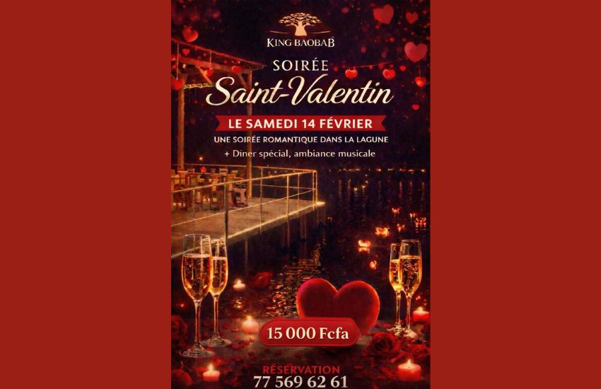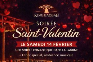 Le samedi 14 février, King Baobab propose une soirée romantique au cœur de la lagune, mêlant dîner spécial Saint-Valentin et ambiance musicale, dans un cadre naturel et apaisant.