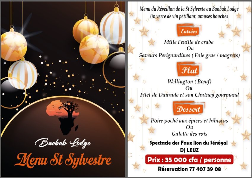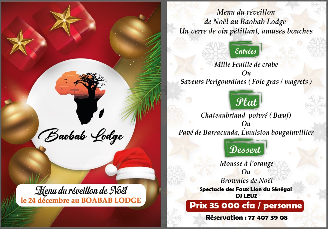 Au programme des festivités du 24 et 31 décembre : spectacle des faux lions du Sénégal avec la troupe Diembé Kang, puis soirée dansante au bord de la piscine animé par DJ Leuz.