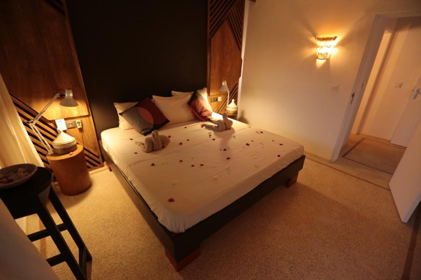 Ces chambres sont parfaites pour accueillir deux personnes, offrant une atmosphère soignée et chaleureuse avec un tarif débutant à 92 000 FCFA (environ 140 €), petit-déjeuner inclus. Chaque chambre offre une vue magnifique sur les jardins fleuris et est équipée pour garantir une expérience reposante et agréable.