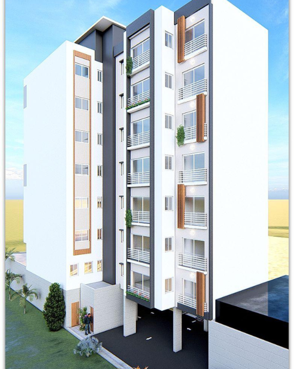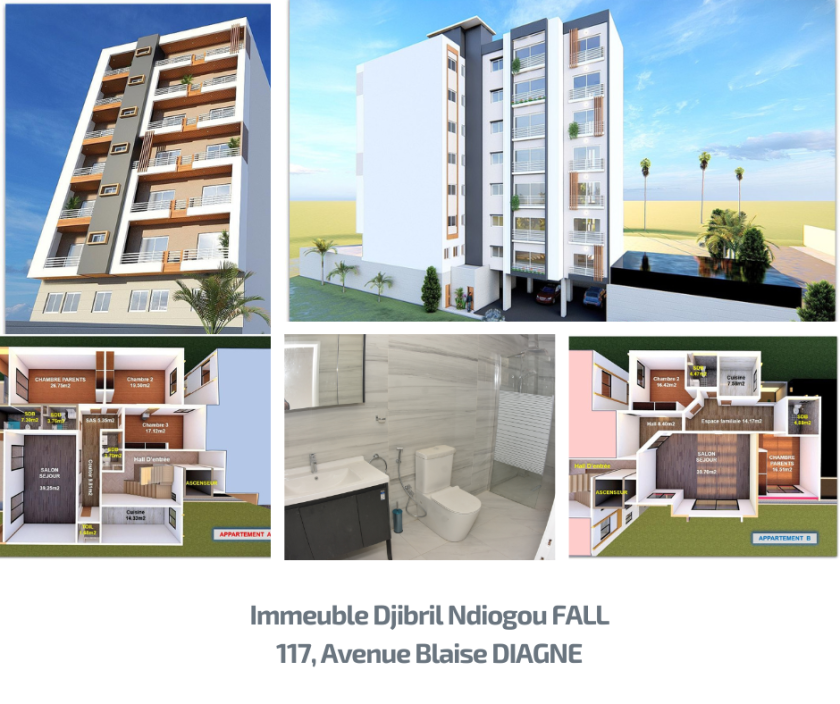 Situé sur l’avenue Blaise Diagne, à l’entrée du centre de Dakar Plateau, le nouvel immeuble Djibril Ndiogou Fall propose sur sept étages 14 appartements de type F3 et F4, soit deux par étage, à partir de 170 millions de CFA.