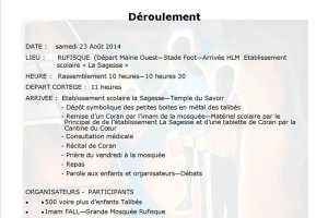 Les enfants « talibés » de Rufisque, en collaboration avec l’association « Cantine du Cœur », organisent une marche le samedi 23 août 2014 à partir de 11h. Cette marche a pour but de promouvoir l’éducation de ces enfants défavorisés.