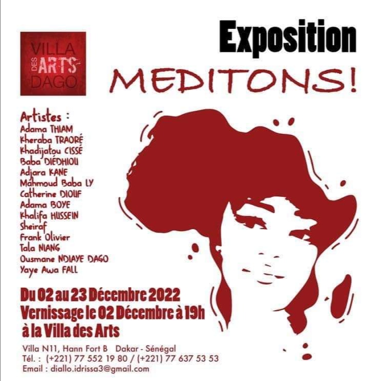 « Méditons ! » est une exposition collective de Baba Diédhiou, Mahmoud Baba Ly, Khadijatou Cissé, Ousmane Ndiaye Dago, Adama Thiam, Adjara Kane, Sheiraf, Frank Olivier, Tala Niang, Catherine Diouf, Adama Boye, Kheraba Traoré, Khalifa Hussein et Yaye Hawa Fall, artistes de différentes générations.